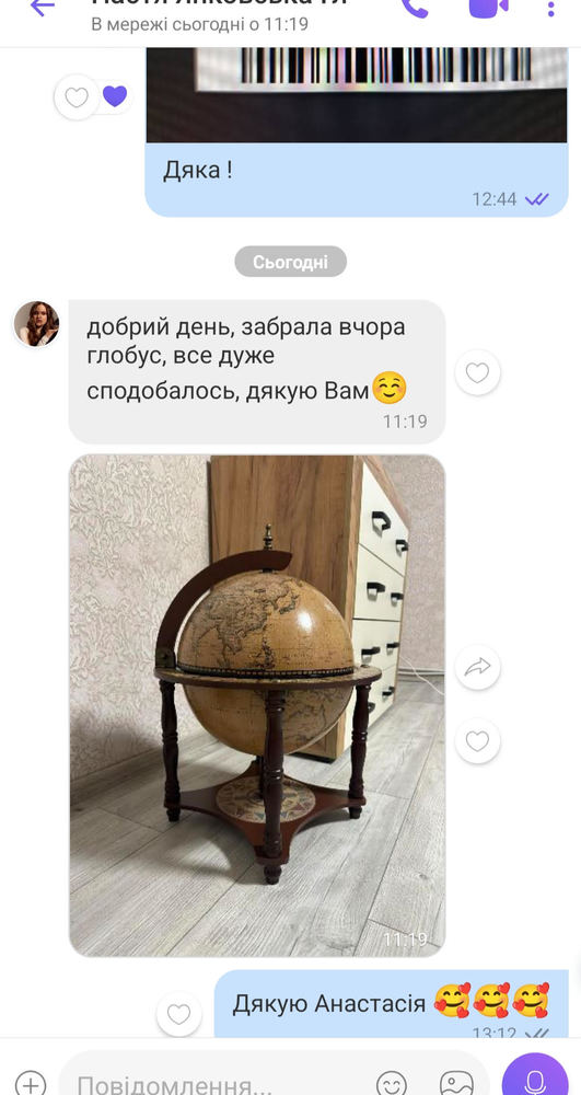 Дякую посилку отримали. Глобус дуже гарно підійшов по кольору до меблів. Подарунок вийшов як треба. Аліна 24.02.25 Кропивницький