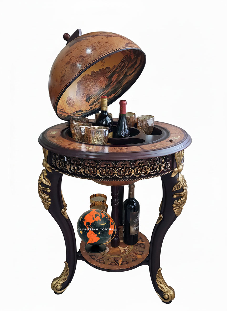 Глобус-бар 45001RN15 з позолоченими фігурними ніжками та великою сферою вирізняється нестандартним класичним дизайном і розкішним виглядом. Має просторе відділення для пляшок і келихів, стане яскравим акцентом інтер’єру та вишуканим подарунком.